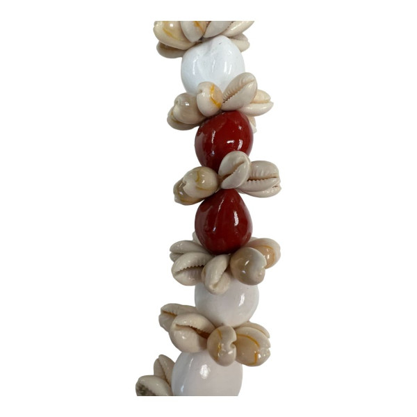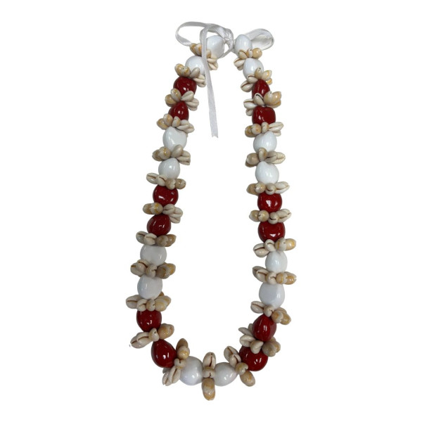 Black kukui nut necklace with cowry shell, alternating red and white colored.