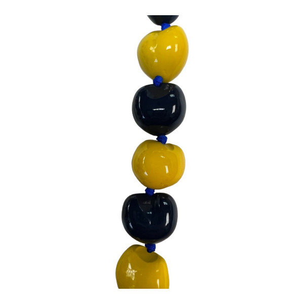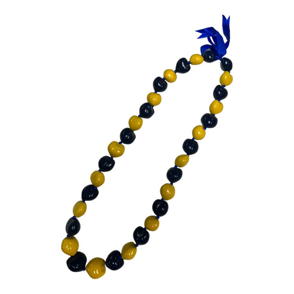 Black kukui nut necklace with painted alternating yellow and navy blue color.